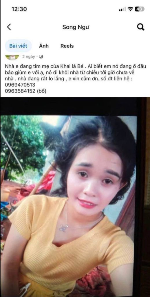 Theo thông tin ban đầu, sáng 7/10, chị B. điều khiển xe máy đưa con đi học. Đến tối cùng ngày, gia đình không thấy chị về, gọi điện không liên lạc được nên tổ chức tìm kiếm nhưng không có kết quả. Sau đó, khi công an thông báo, gia đình đến nhận dạng và xác nhận thi thể là chị B. Tại hiện trường, cơ quan công an không tìm thấy điện thoại và xe máy của nạn nhân.