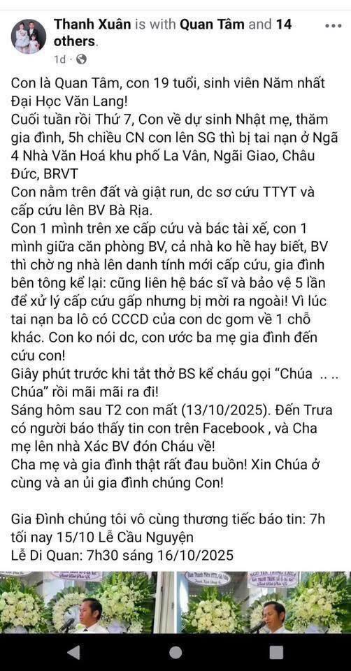 Theo thông tin đăng tải trên mạng xã hội, chiều 12-10, em Đ.Đ.Q.T. (sinh viên năm nhất một trường đại học tại TP HCM) trên đường từ nhà trở lại trường học thì xảy ra tai nạn tại khu phố La Vân, xã Ngãi Giao, huyện Châu Đức.