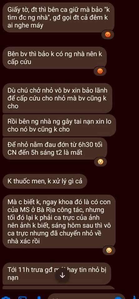 “Nạn nhân được người dân đưa vào Trung tâm Y tế Châu Đức sơ cứu rồi chuyển lên Bệnh viện Đa khoa Bà Rịa. Tuy nhiên, gia đình cho rằng khi đến bệnh viện, em T. không được cấp cứu ngay mà phải chờ người nhà đến làm thủ tục xác định thông tin bệnh nhân. Thời điểm này, nạn nhân không có người thân đi cùng.