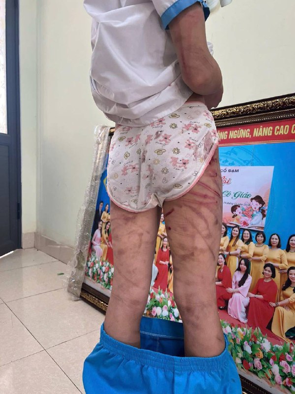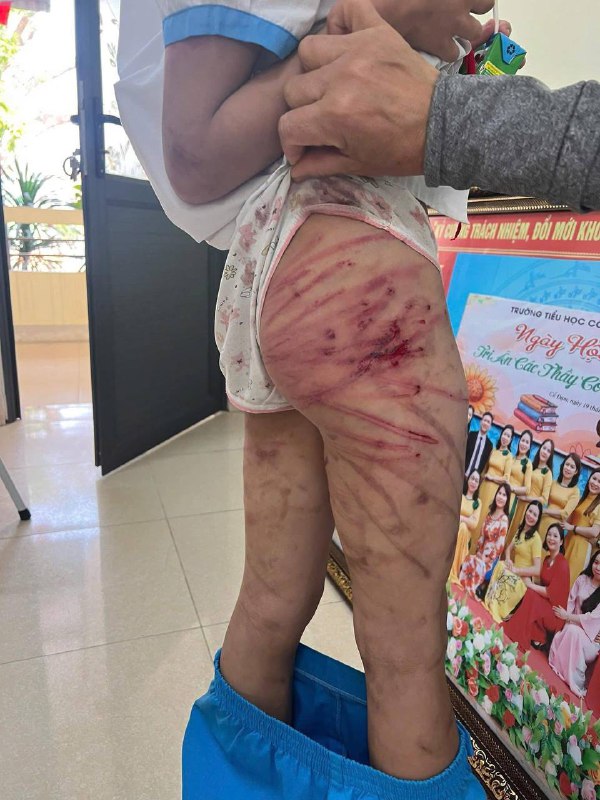 Kết quả kiểm tra y tế cho thấy bé bị nhiều vết thương ở vùng đầu, ngực, tay, đùi, tinh thần hoảng loạn, sợ hãi. Vết thương ở đầu phải khâu 5-6 mũi.