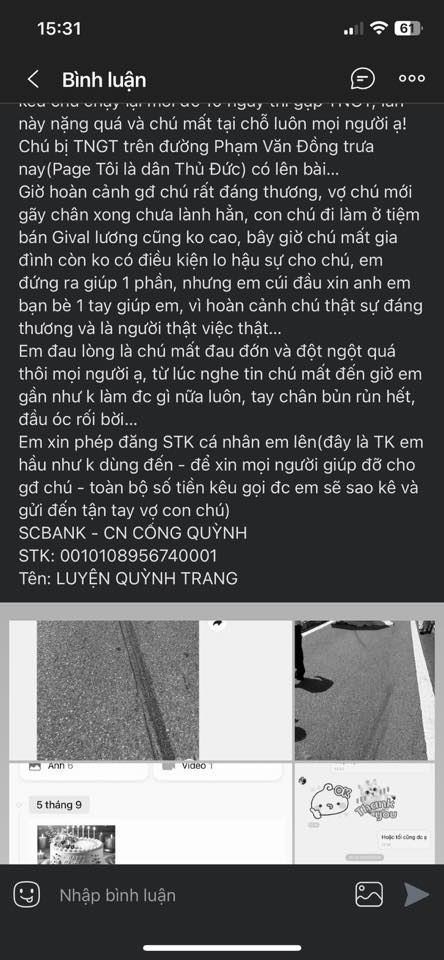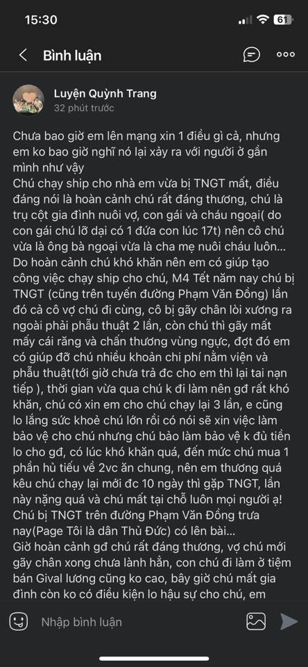 Nạn nhân được xác định là người có hoàn cảnh rất khó khăn.Đáng nói, chú và cô (vợ chú) từng gặp tai nạn giao thông nghiêm trọng cách đây chưa lâu. Cả hai đều bị thương nặng, phải phẫu thuật và điều trị trong thời gian dài. Sau khi hồi phục, chú vẫn cố gắng quay lại làm việc để lo cho con gái và cháu ngoại đang tuổi ăn học. Tai nạn lần này xảy ra khi chú vừa mới trở lại công việc được ít lâu, khiến gia đình rơi vào hoàn cảnh vô cùng thương tâm.