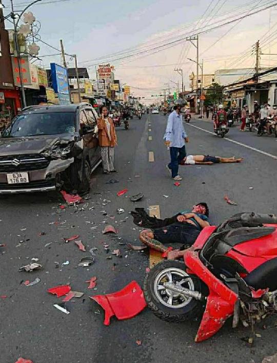 Tại khu vực trung tâm thị trấn Cái Bè, tỉnh Tiền Giang, đã xảy ra một vụ tai nạn giao thông nghiêm trọng giữa xe máy màu đỏ và ô tô màu đen hiệu Suzuki (biển số 63A-176.80).