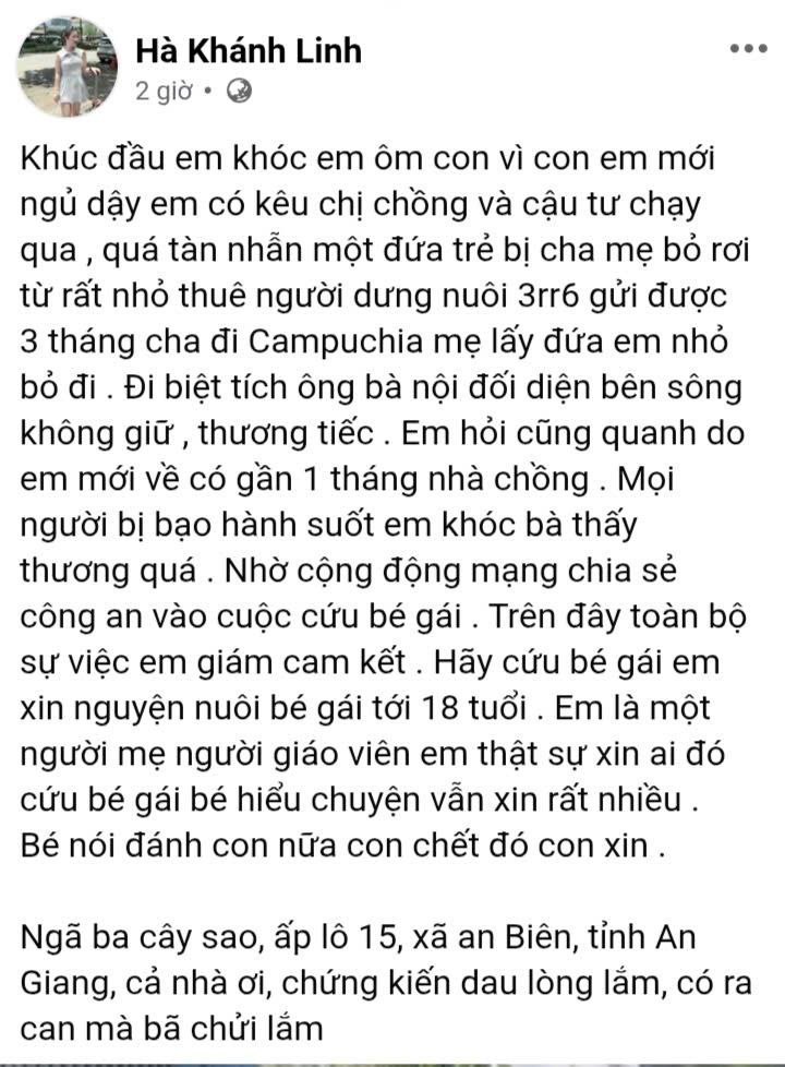 Theo chia sẻ từ tài khoản Facebook Hà Khánh Linh, người này cho biết khi đang ở gần khu vực trên thì phát hiện bé gái bị đối xử tàn nhẫn. Bé bị cha mẹ bỏ rơi từ nhỏ, sau đó được gửi cho người khác nuôi dưỡng. Tuy nhiên, trong thời gian sống tại nhà chồng của người mẹ, bé thường xuyên bị đánh đập, bạo hành, đến mức bản thân bé bật khóc cầu xin: “Đánh con nữa con chết đó, con xin.”