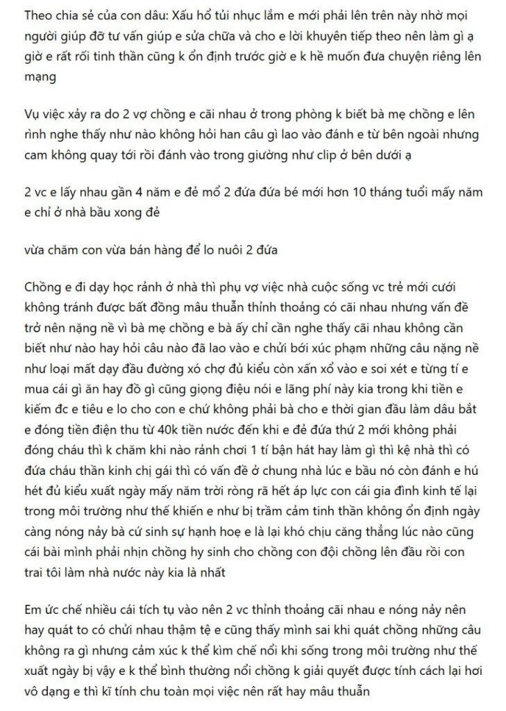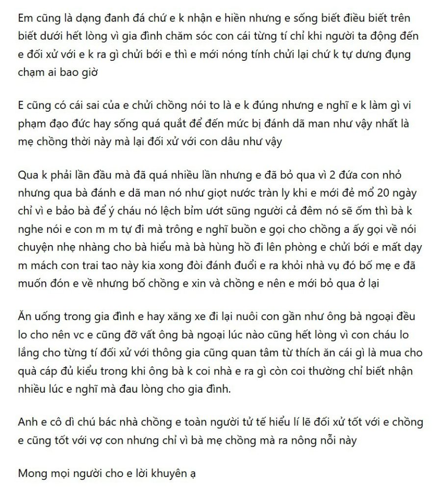 Tuy nhiên, do mâu thuẫn trong sinh hoạt và lời qua tiếng lại giữa vợ chồng, mẹ chồng nhiều lần xen vào, xúc phạm và có hành động bạo lực. Người con dâu cho biết, dù đã nhịn nhục vì con, nhưng sau khi bị đánh “dã man” trong lúc mới sinh hơn 20 ngày, cô không chịu nổi và buộc phải chia sẻ sự việc lên mạng để nhờ mọi người tư vấn, giúp đỡ.