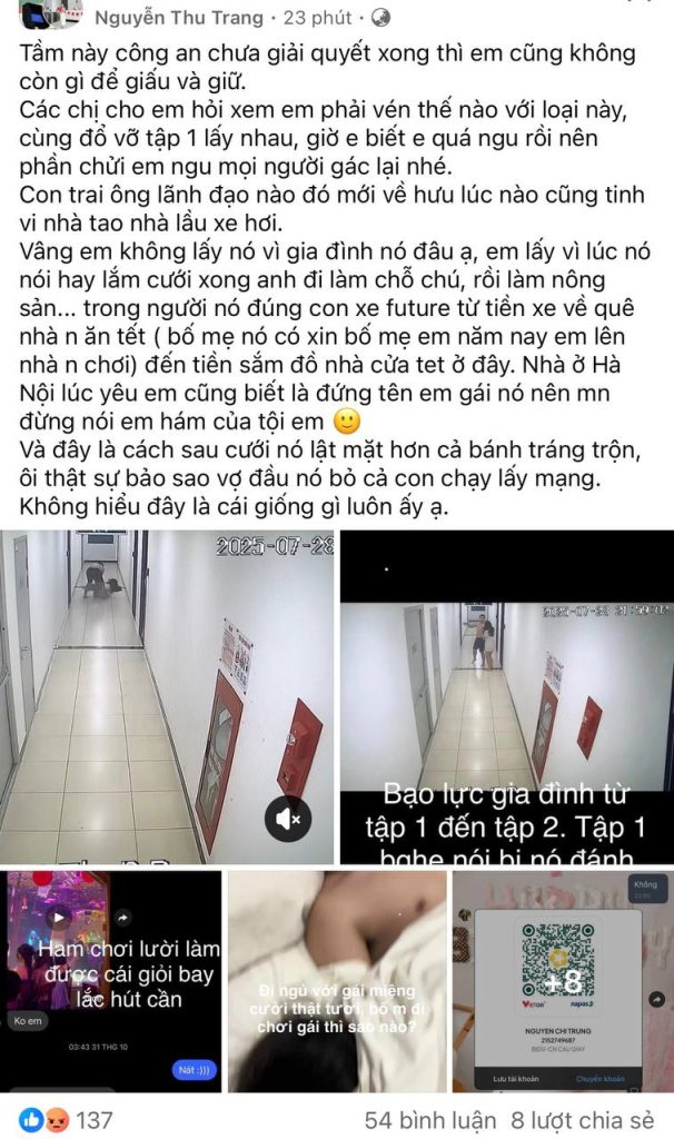 Ngày 12/11 Chị Thu Trang (29 tuổi) kể lại sự việc nảy sinh vào tối 28/7/2025. Hôm đó, vì bận công việc nên tới 19h chị Trang mới về nhà, và bị chồng (tên T.) quát mắng do không về sớm nấu cơm khi có bố mẹ chồng xuống chơi.