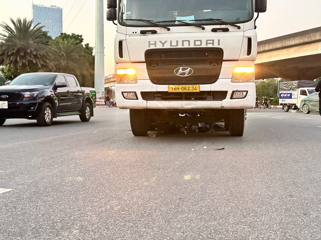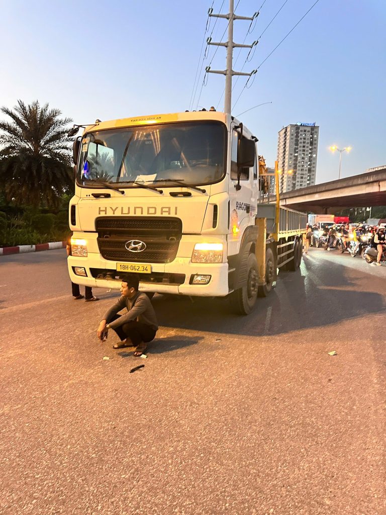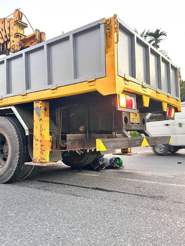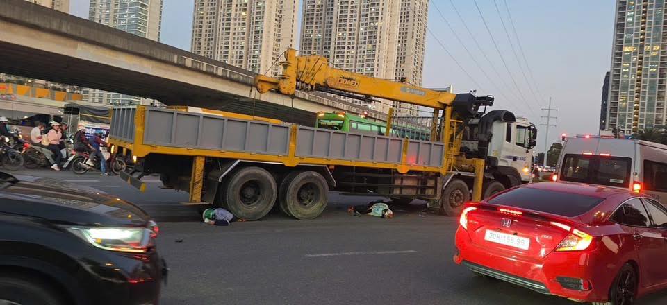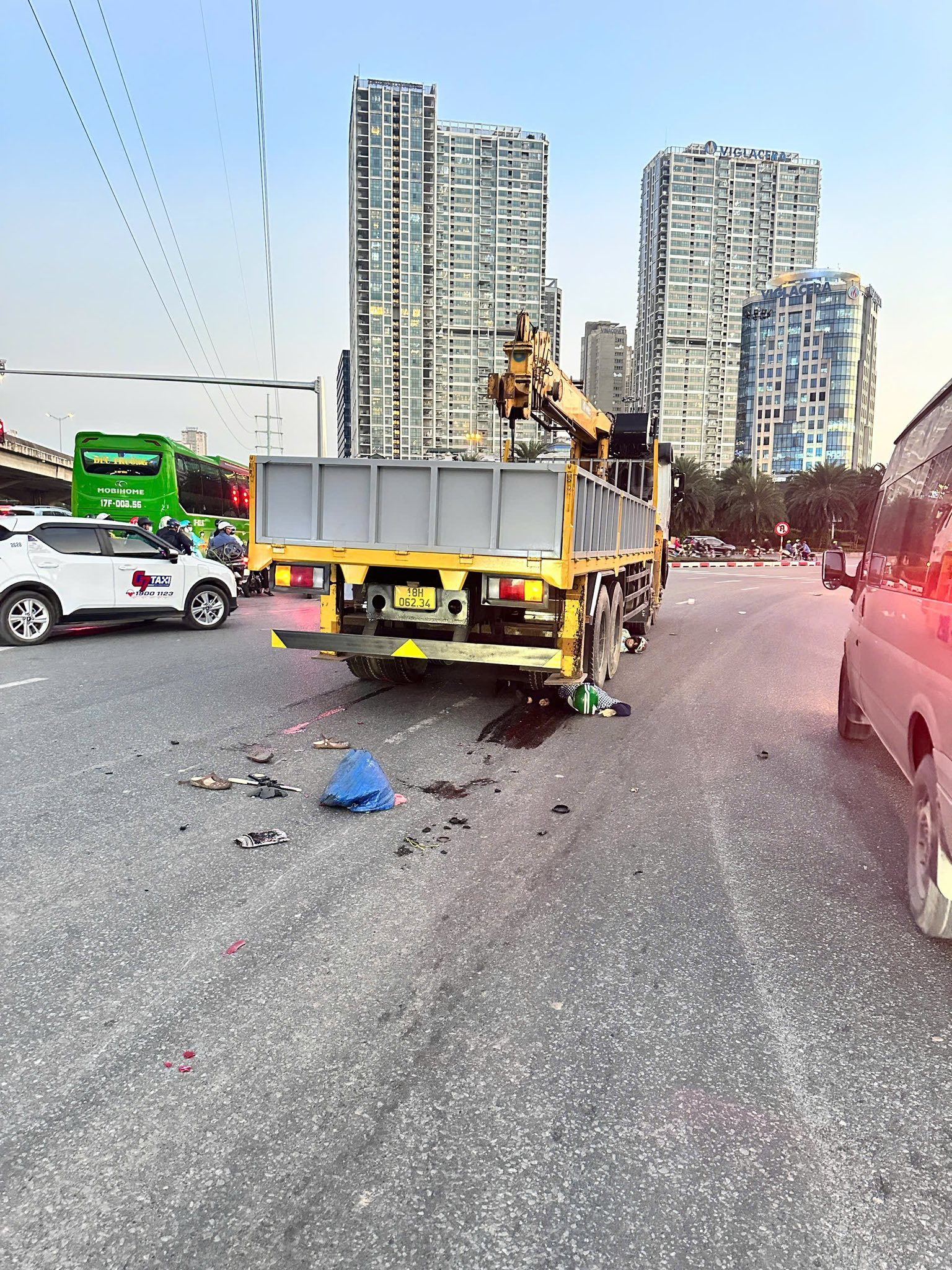 Theo hình ảnh hiện trường, xe tải dừng giữa làn đường, phần gầm xe và khu vực phía sau có hai nạn nhân bị cuốn vào. Một xe máy bị hư hỏng nặng nằm gần đó, nhiều mũ bảo hiểm, túi đồ và mảnh vỡ rơi vãi trên mặt đường.