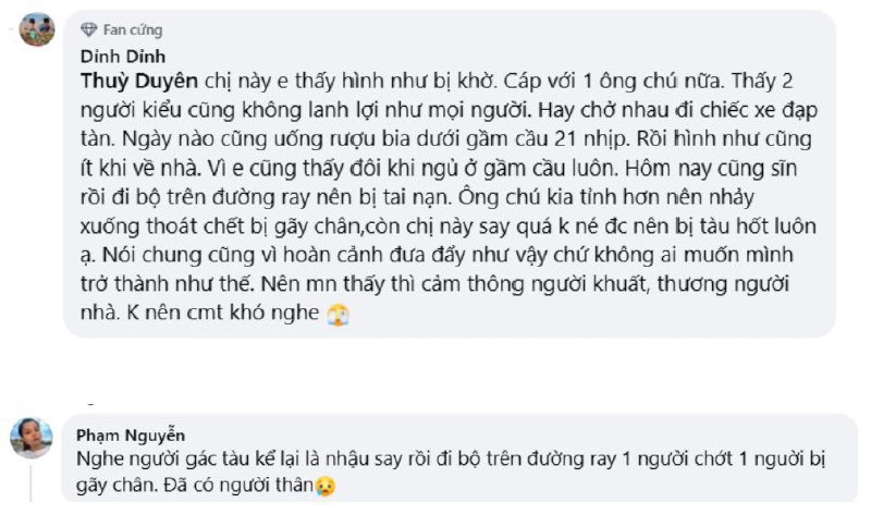 Một số người cho biết nạn nhân thuộc nhóm hai người thường xuyên uống rượu và đi lại bằng xe đạp trên địa bàn. Thời điểm xảy ra tai nạn, cả hai được cho là đã uống rượu; một người may mắn thoát nạn, người còn lại không qua khỏi.